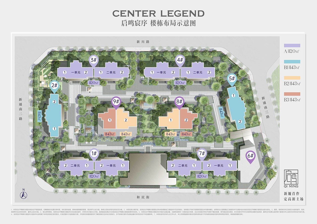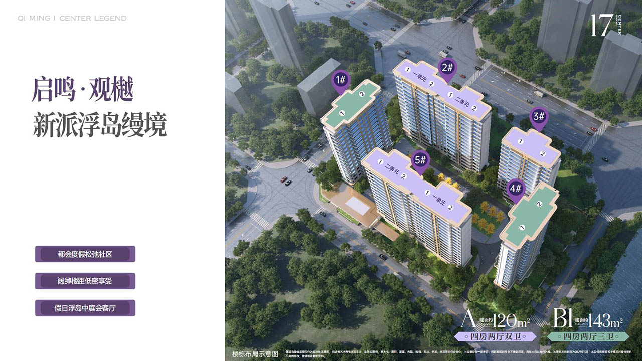 产品纯粹,只做了120㎡和143㎡两个面积段产品。启鸣双子均采用围合式设计,观樾打造围合式社区,南北楼栋整齐排布,楼间距拓展约94米,营造极致开阔的居住视野;宸序同样采用围合式布局,阵列+围合式排布,形成独特空间设计。